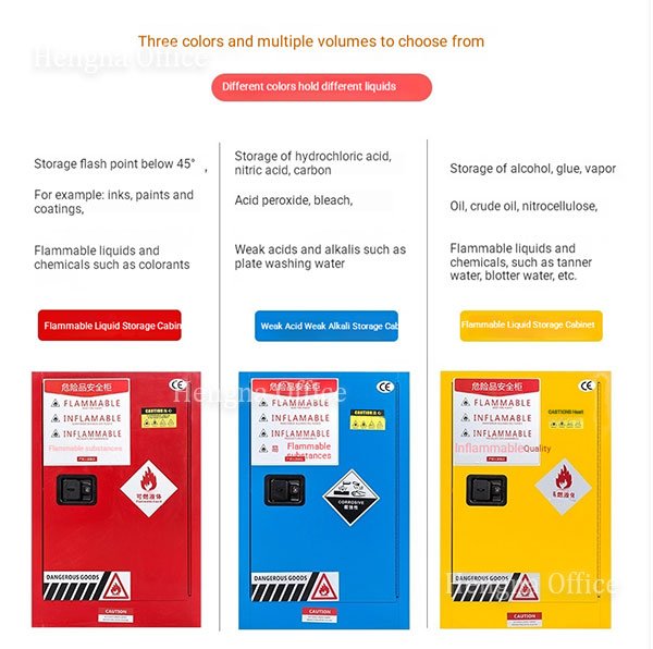 A: No. You should not store strong corrosives in a standard steel flammable cabinet. For acids and alkalis (like hydrochloric acid or bleach), please choose our Blue Weak Acid/Alkali Storage Cabinet, which has specialized anti-corrosion interior trays.