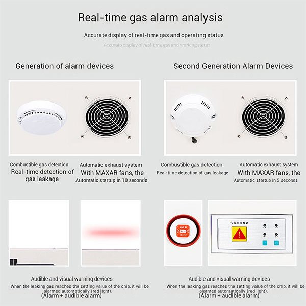 - MAXAR High-Performance Fan: Upon detecting a leak, the system triggers the MAXAR fan within 5 seconds, forcefully expelling accumulated flammable gases and preventing concentrations from reaching explosive limits. This dramatic reduction in response time significantly boosts safety margins.