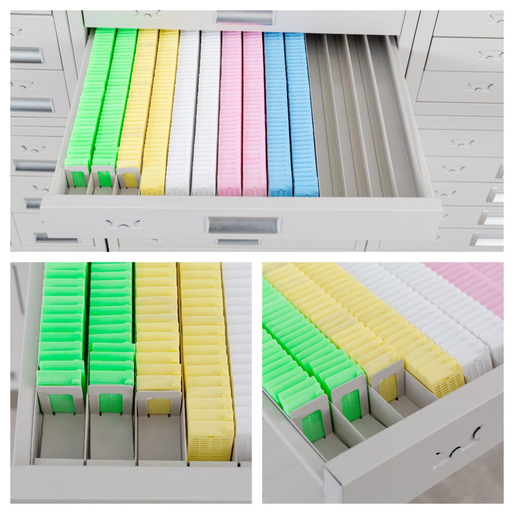 Unlike horizontal stacking, which can lead to blocks sticking together or labels being obscured, vertical filing ensures that each cassette is easily visible and accessible. This method also protects the delicate wax edges of the blocks, maintaining specimen quality for decades.