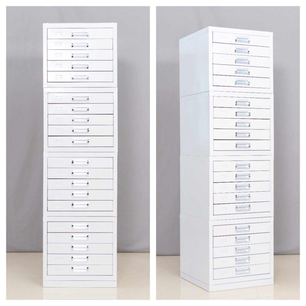 While the HNQST-450dw52c is sold as a Single 5-Drawer Unit, we highly recommend the 4-unit stack configuration for optimal ergonomic height and maximum storage density. Each unit features interlocking mechanisms to ensure stability when stacked.